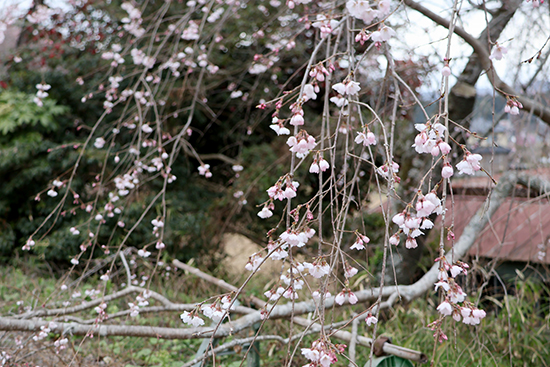 謡曲『櫻川』に謡われた「糸桜」(左)、とエドヒガンが開花しています。(五分咲き)