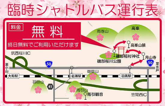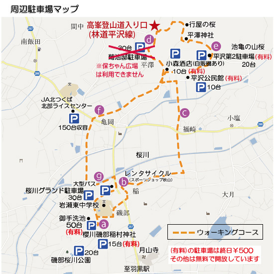 高峯山に登る「平沢林道」は、開花期間中車輌通行止めとなってお ります。 また、高峯山麓の平沢地区の道路は生活道路や農道となっております ので、路上駐車はご遠慮ください。 マップ上の駐車場は、(有料)の表示以外はすべて無料で開放しており ますので、そちらをご利用いただけますようお願い申し上げます。 (駐車場にウォーキングルートの案内がありますので、車を降りて歩 いての散策をお奨めします)